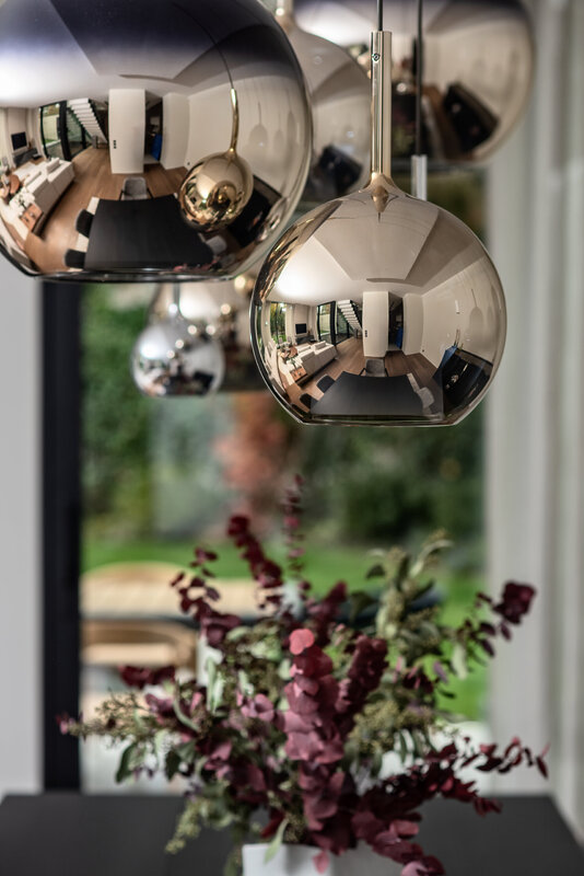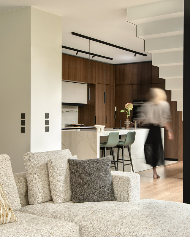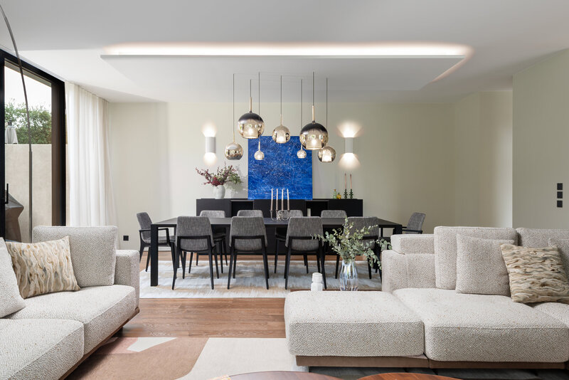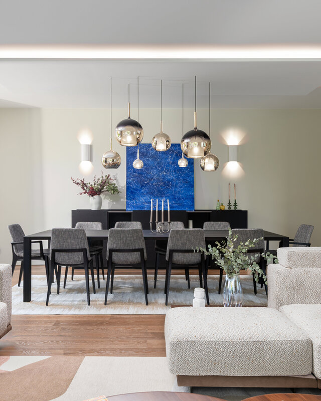 Les grands volumes, la belle hauteur sous plafond, les finitions en marbre et les larges baies vitrées ont offert un terrain de jeu idéal pour imaginer un univers à la fois lumineux, raffiné et chaleureux.