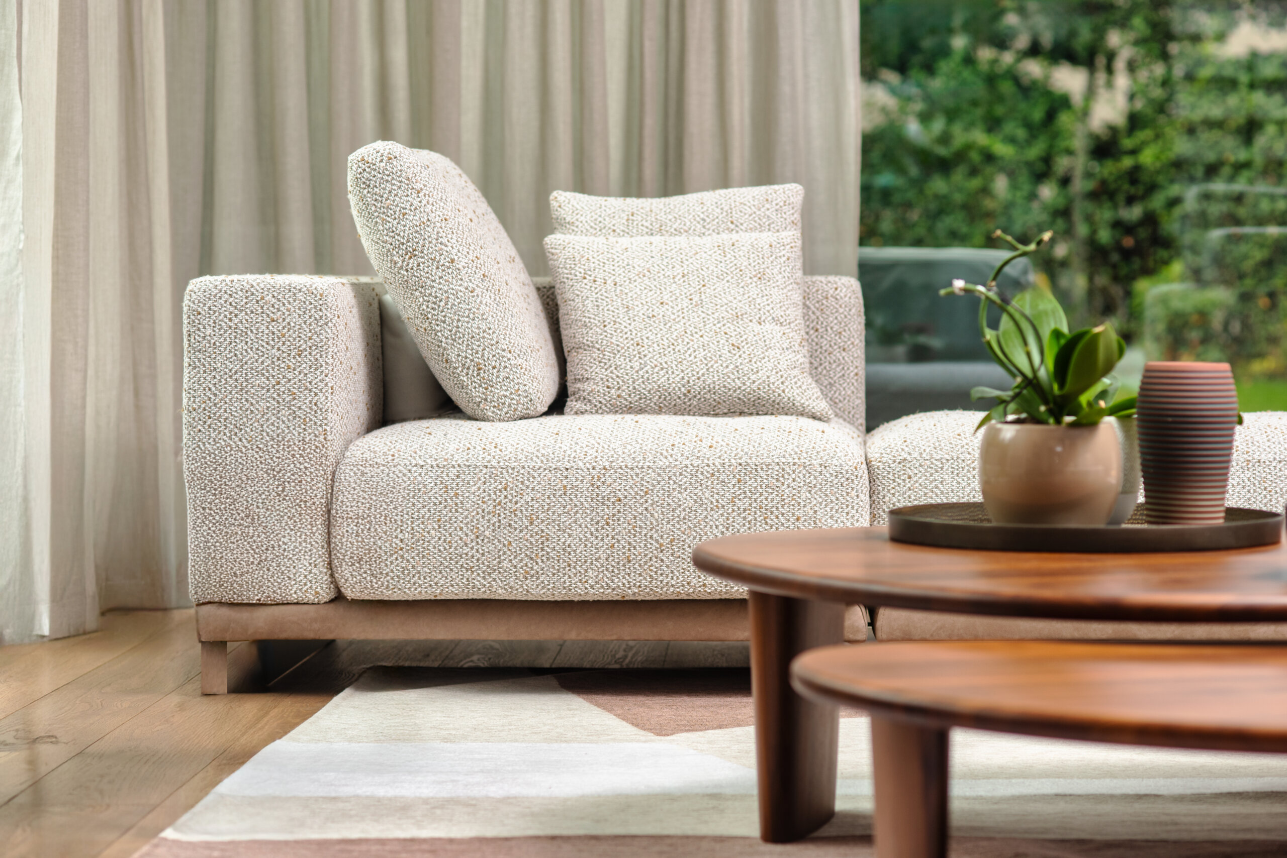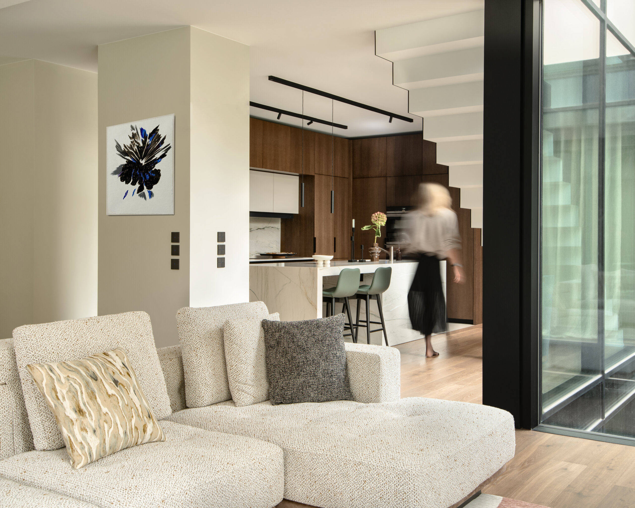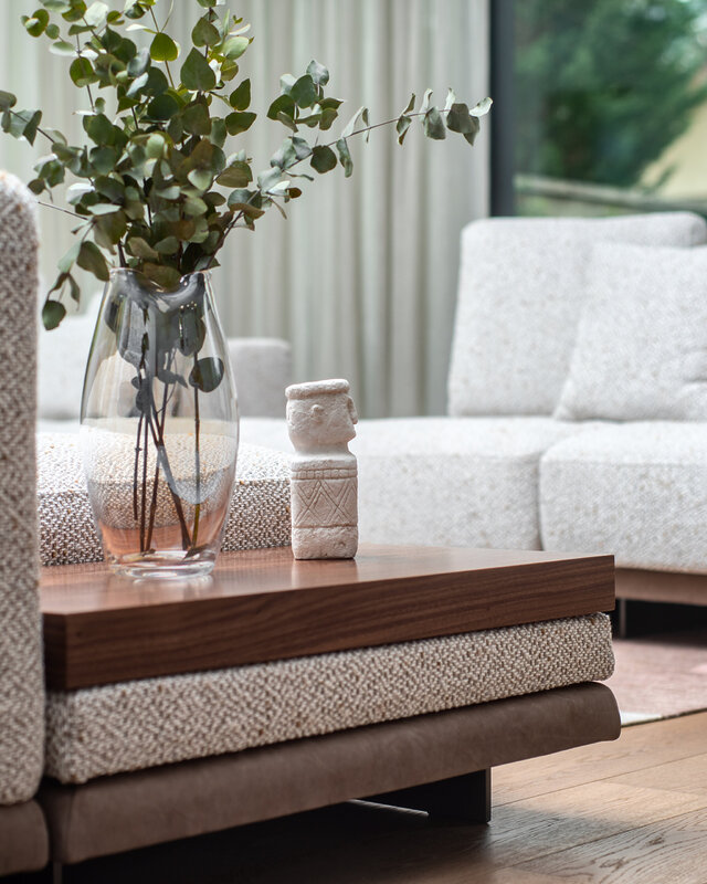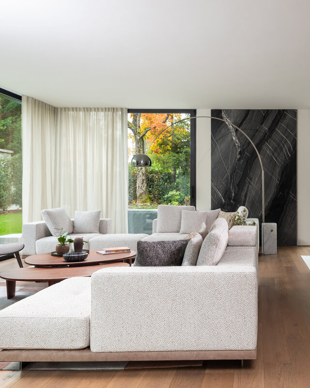 Parmi les pièces maîtresses du projet, le canapé a été entièrement conçu sur mesure afin de s’adapter parfaitement aux volumes généreux du salon. Les clients ont pu choisir eux-mêmes les finitions, les tissus et les détails de confection, pour un résultat unique, à leur image, alliant confort, élégance et harmonie avec l’ensemble de l’espace.